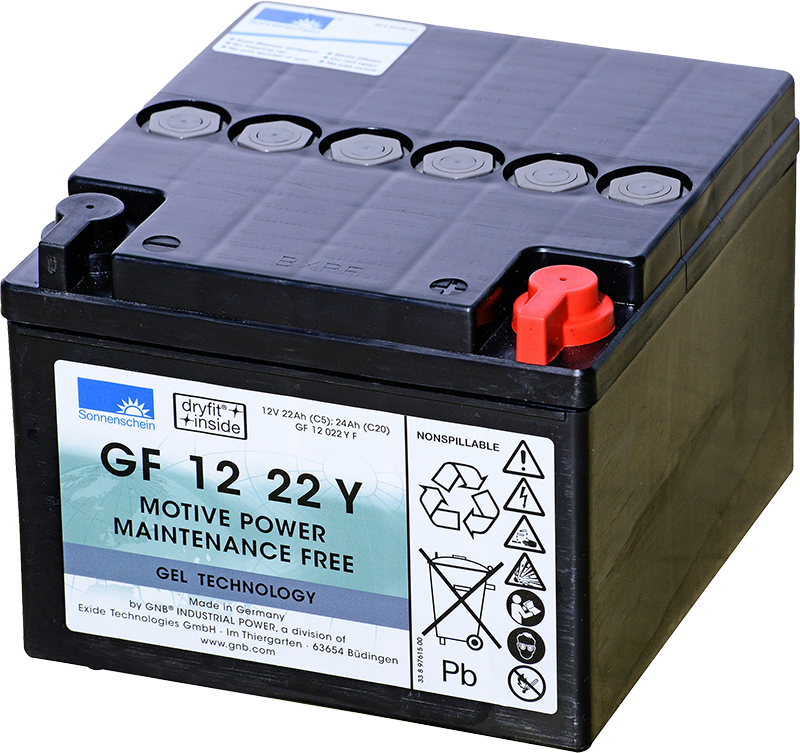 Sonnenschein GF-Y-serien är särskilt lämplig för fritids- och mobilitetsmarknaden, inklusive elektriska båtar, golfbilar, rullstolar och skotrar. VRLA-teknologi (ventilreglerad blybatteriteknik), elektrolyten är bunden i en gel. Underhållsfri (ingen påfyllning) under hela livslängden tack vare Sonnenschein dryfit®-teknologi. 450 cykler enligt IEC 60254-1. Mycket robust konstruktion.